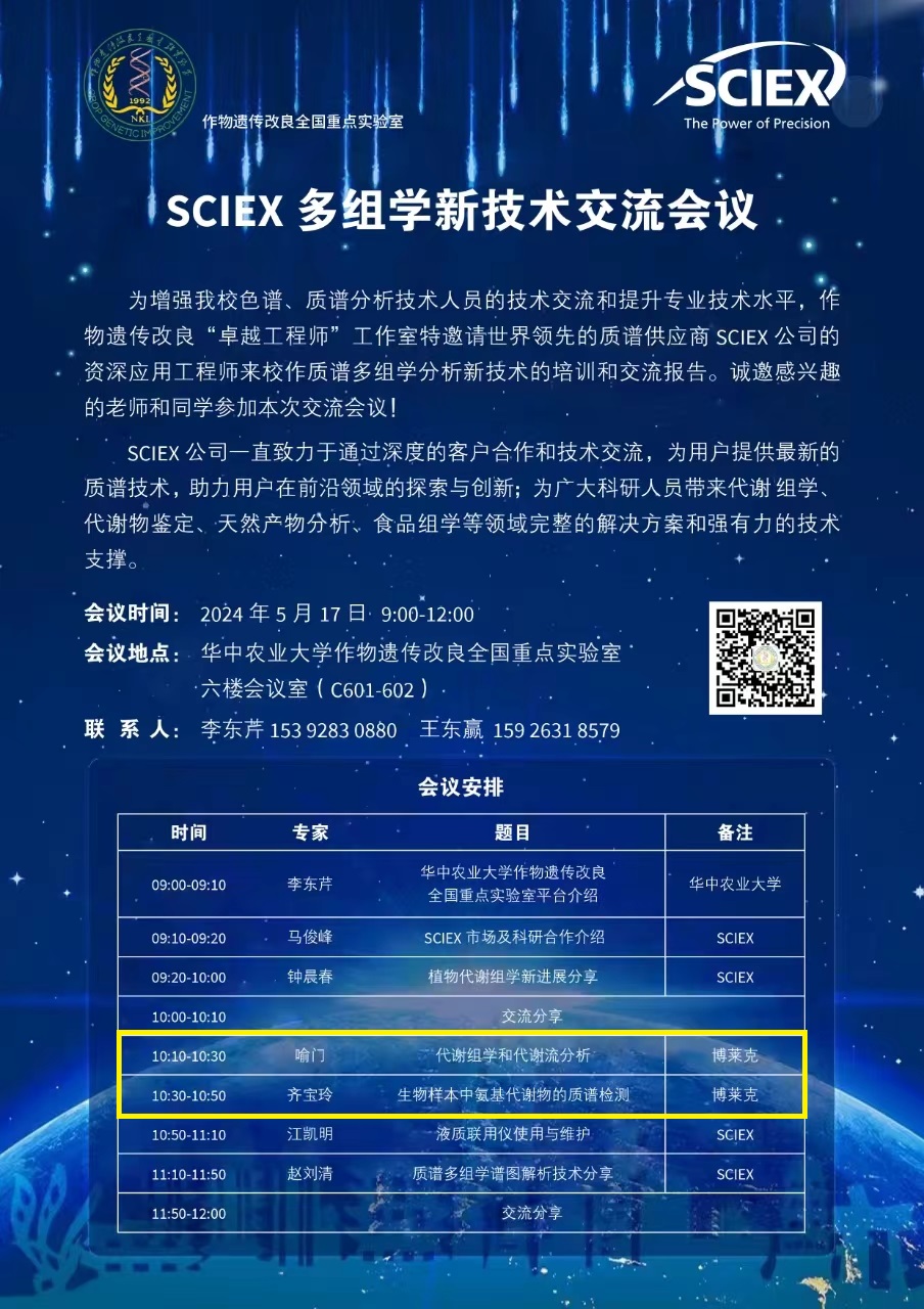 一朝春夏改,隔夜鳥花遷。2024年5月17日,我司受SCIEX 公司邀請(qǐng)將在華中農(nóng)業(yè)大學(xué)作物遺傳改良全國(guó)重點(diǎn)實(shí)驗(yàn)室與大家分享代謝組學(xué)相關(guān)知識(shí)。屆時(shí)歡迎各位新老朋友現(xiàn)場(chǎng)交流!